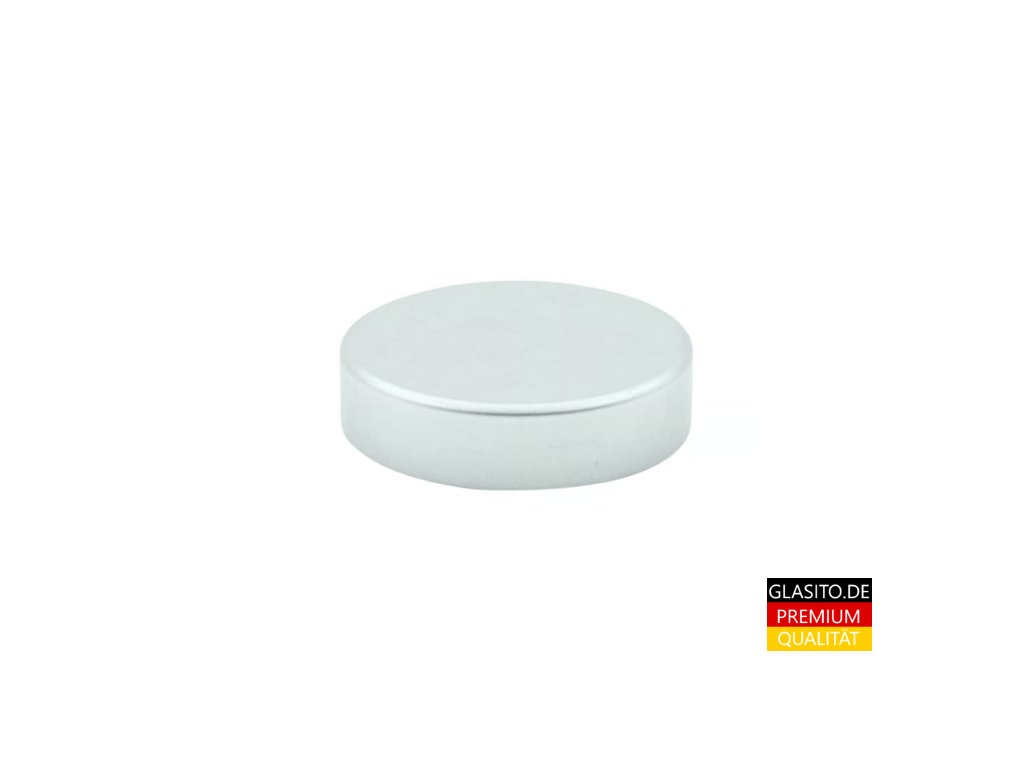 Silberne Metallkappe mit Kunststoffeinsatz für Apothekerglas mit einem Durchmesser von 38 mm. Thermisches Induktionsverschließen.